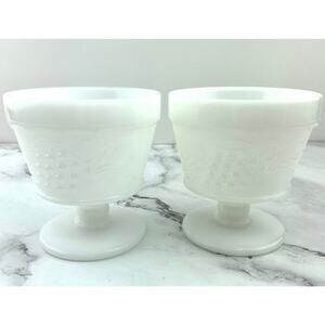 This set of 2 White Milk Glass Sherbert/Sorbet Goblet Cups features the Anchor Hocking Pressed Grape and Leaf Design.