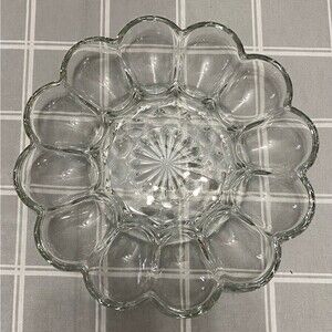 Vintage Anchor Hocking 10" Diameter Devil Egg Platter Prescut Clear Glass Devil Egg Plate holds 12) Deviled Eggs and the center area Relish Cracker Snack Appetizer Tray Platter