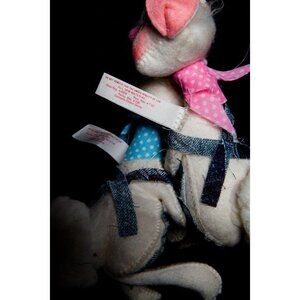 The male doll has quite the expression on his face. He is wearing a blue and white polka dot bandana around his neck and he is dressed in blue jean overalls. A perfect pink 1/4" pom pom forms both their noses.
