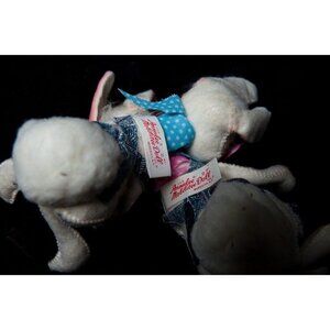 The female is adorable in her pink and white polka dot bandana around her neck. Her overalls are so cute.