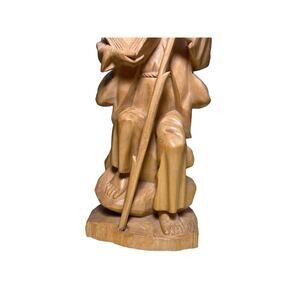 This vintage hand-carved figurine depicts a bearded man wearing a hat standing, and holding a book in one hand and a stick in the other.