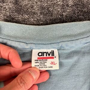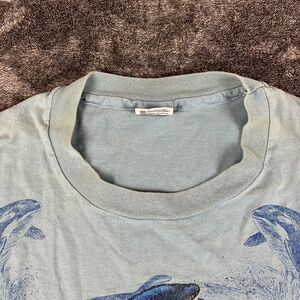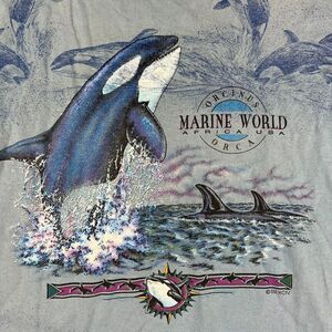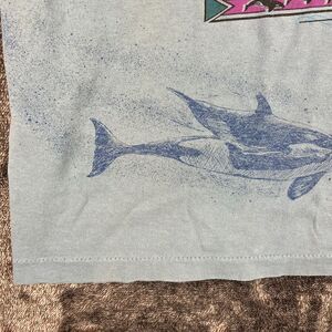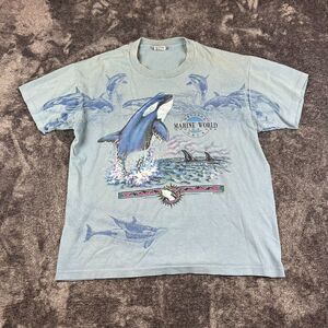 Vtg Anvil Orca Whale Marine World AOP Single Stitch T-Shirt Men's XL Blue USA. **Pinhole on back bottom of shirt and a stain on back top of shirt as shown in photos. Also, some discoloration on neckline. No other flaws noted. Refer to all photos for condition and sizing.