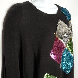Vtg Argyle Geometric Beaded Sequin Party Sweater 2X Black Silver Pink Green Blue