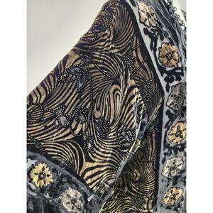 This vintage kimono from Aris A is a stunning piece that will make you stand out in any crowd. The black and amber color combination gives it a hippie, bohemian vibe that is perfect for a party or casual occasion. The kimono has a relaxed fit and is made of a burnout velvet fabric that is both soft and durable.