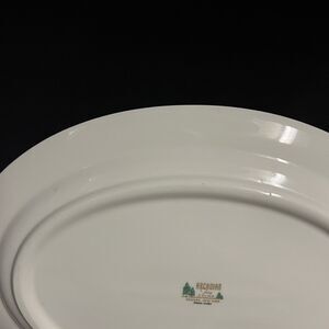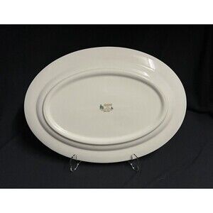 The backstamp is printed with the product line name, Arcadian Fine China. The finish is glossy, adding to the platter's overall elegance. This platter is perfect for both decorative and functional use, and its art pottery production style makes it a unique and special piece.