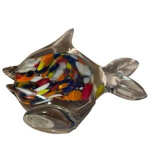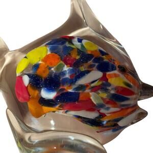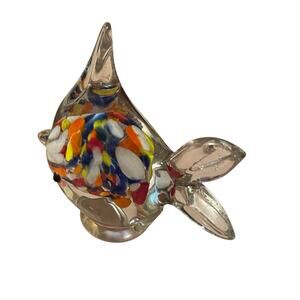 Fish figurine, with the clear glass and the colorful, confetti-like glass is reminiscent of a glass art technique of Murano style" or "Fiorato" (flower work). With a mid-century modern design, this 5" tall and 5.5" wide glass paperweight has glossy finish and intricate details make it a standout addition to any collection of decorative pottery and glassware, perfect for those who appreciate art glass and fish-themed decor.