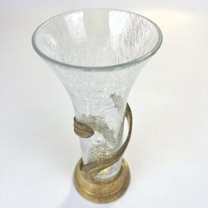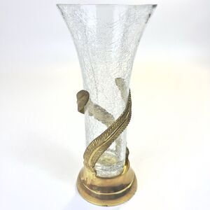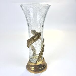 Vtg Art Nouveau Style Brass Base With Crackle Glass Vase Feather Vine Boho Decor