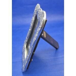 The product is a vintage Arte Giancarlo pewterl picture frame with a wood back, suitable for a 4 x 6 inch photo. The frame is of silver color, featuring an Art Nouveau floral design. The tabletop stand frame is heavy-duty and originally made in Honduras, making it a unique and decorative collectible for showcasing a single portrait orientation photo. With a spacious interior and sturdy construction, this frame offers a stylish and classic way to display your cherished memories.