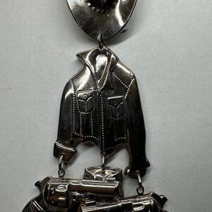 This vintage articulating cowboy brooch is a unique piece, complete with movable parts including a cowboy hat, jacket, crossed revolvers, and boots. The detailed craftsmanship captures the spirit of the wild west, making it a standout item for collectors. The brooch measures approximately 3 inches in length and is made of high-quality metal with a shiny finish. Ideal for western-themed jewelry enthusiasts or vintage accessory collectors, this brooch is a rare find and a perfect addition to any collection.