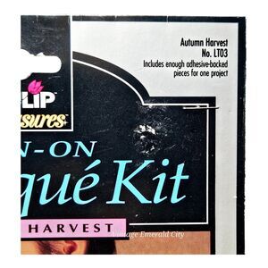 Keywords: Vintage iron-on applique, Tulip Treasures applique kit, 1993 craft kit, autumn harvest applique, retro DIY fashion, metallic lamé iron-on, seasonal fabric crafts, vintage sewing supplies, fall-themed embellishments, manualidades vintage, apliques de planchar.