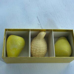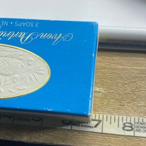 This set of Avon Partridge & Pear Soaps includes three intricately designed soaps, each weighing 2 ounces. The soaps come in their original decorative box from the 1980s.
