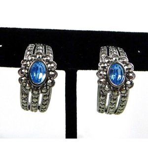 Faux marcasite half hoop earrings with blue stone in the