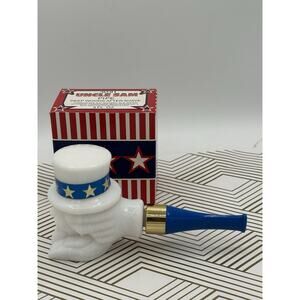 This collectible item is a glass bottle shaped like a pipe with an Uncle Sam head wearing a top hat.