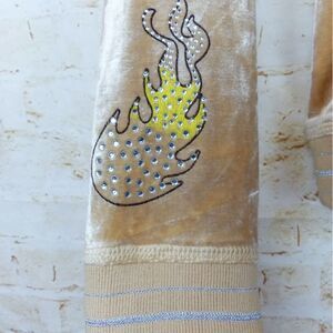 Pre-owned, Vintaget BCBGMAXAZRIA Y2K Velour Hoodie Track Jacket M Beige Rhinestone Graphic Flame. Lots of cool details. Metallic stripe on rib knit.