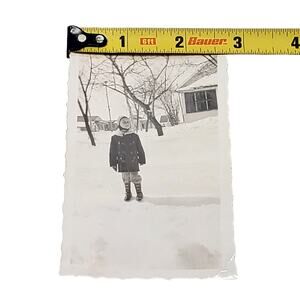 Vintage Black and White Photo 1942 Found Child Posing In Snow Winter Wonderland Scene Snapshot, Portrait, 4.5 in x 2.75 in. View all pictures before purchasing. Item will be packed with care. Message me if you have any questions. Browse and save my store for antique and vintage collectibles. Reasonable offers are considered.