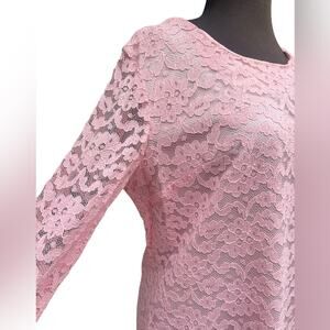 Vtg Baby Pink Floral Lace Sleeve Modest Sheer Feminine Coquette Sheath Dress M