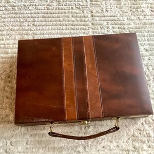 Vtg Backgammon Board Game Set Faux Brown Leather Travel Case Interior Stitched