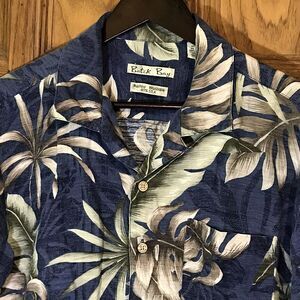 Vintage Batik Bay 100% Silk Hawaiian Shirt. Men's size Medium, Blue & Tan, Tropical Leaf Print, Short Sleeve, Top Loop, Button Up, cruise, beach, party, Bahamas Shirt.
