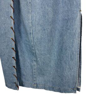 This vintage Be Bop denim maxi skirt offers a timeless design with a unique lace-up side detail and side slits for added style and comfort.
