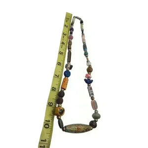 A beautiful vintage trade bead necklace with a lot of different pieces. This has an old vintage clasp. This necklace has carved fetish animals, Murani glass beads, carved wood, and seashell.