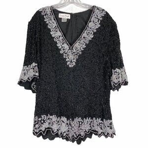 Vtg Beaded Top Blouse Silk Black Black Dressy Party Formal 1X