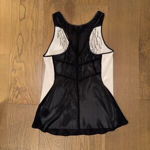 • Back: Chic black mesh/sheer racerback design, which is also embellished with small sequin streaks.