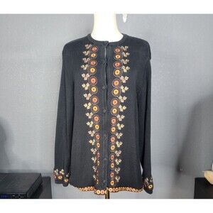 Vtg Bechamel Womens L Black Knit Embroidered Autum Leave Floral Button Cardigan
