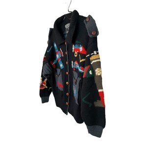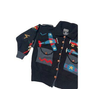 Vtg Berek Sweater Cardigan Small Wool Grandpa Black Airplane Plane Helicopter