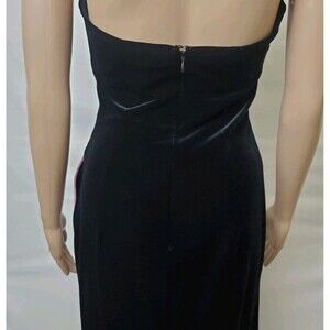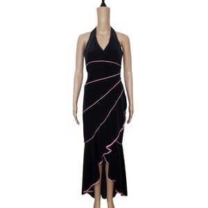 Vtg Betsy & Adam Halter Dress 6 Black Velvet Ruffle Maxi Pink Trim Hi Low Whimsigoth USA