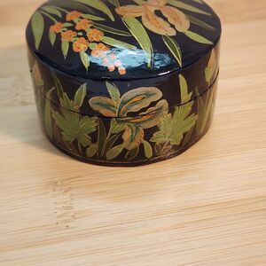 Vtg Black Lacquer Trinket Jewelry Keepsake Box Round Floral Design Hand-painted