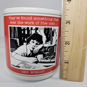 Vtg Black White Coffee Cup Red Mug Comic Strip One Woman Does The Work Of 5 Men