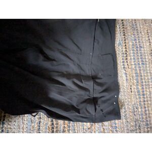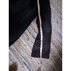 This Mackintosh Black Wool Embroidered Collar Opera Swing Coat is a vintage piece made in the USA. It features a relaxed fit with a mid-length silhouette and long sleeves, perfect for cooler weather. The coat is crafted from 100% wool with an embroidered collar for a touch of elegance, making it a stylish outerwear option for women in size L. Additionally, it includes classic pea coat elements like shoulder pads and an open closure, adding to its timeless appeal.