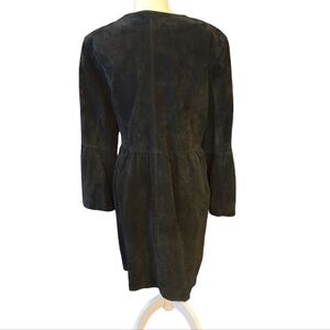 DGH Black suede snap front chic minimalist drop waist bell sleeve midi dress
