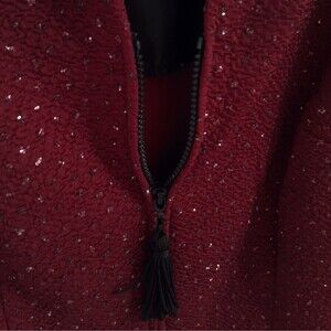 Add a touch of glamour to your eveningwear with this vintage red jacket from Sheri Martin. The piece features a fitted style with shoulder pads and tassel detailing, perfect for a special occasion. The jacket is made of stretchy textured polyester material with a glitter finish, making it a standout piece in any outfit. This jacket is labeled as a women's size 8P, equivalent to medium, and is suitable for petites. The whimsigoth style and dark color make it a versatile addition to any vintage clothing collection. Whether you're dressing up for an evening event or adding a touch of sparkle to your everyday look, this original Sheri Martin jacket is the perfect choice.
