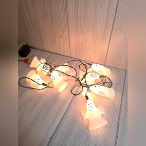 Spooky ghost string lights. Perfect for Halloween decor. Features white ghost figures.