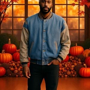 Vtg Blue Denim Tan Canvas Varsity Chore Bomber Jacket with Ribbed Details Sz L