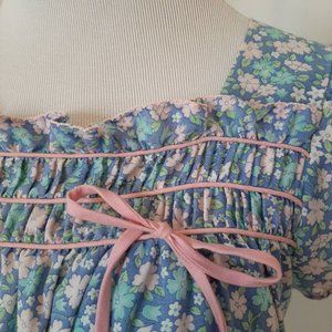 Wear this day or night for a cute and easy prairie look! Blue cottage florals with a square neckline and gathered rows in pink piping trim front and back, with a pink bow detail! Short flutter cap sleeves. Hits about ankle length. No pockets. Feels like 100% cotton. Estimated late 70s-80s. by Tom Bezduda for Barad & Co. Wonderful vintage condition! There may be small signs of normal wear, but nothing significant to note! Size: Tagged size "Petite", fits like a Small-Medium. Shown on my size Small dress form to get an idea. Laid flat- Shoulders 11.5" Chest 19" Waist 22" Hips 24" Total Length 52" ***Belt is shown for styling purposes only :)