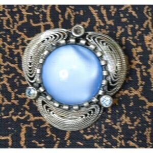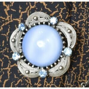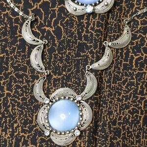 Vtg. Blue Glass Moonstone / Givre Necklace, Clip Earrings & Pin Brooch Parure