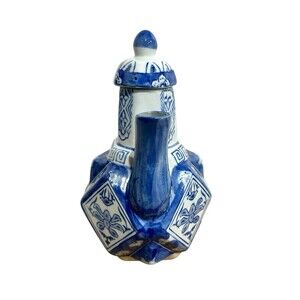 The product is a vintage blue and white floral porcelain tea pot with a geometric shaped design, originating from China. This Asian tea pot is a traditional Chinese cultural piece that would be a valuable addition to any collection of Chinese collectibles. The tea pot does not appear to be handmade, making it a unique and aesthetically pleasing item for those interested in traditional Chinese art and craftsmanship.