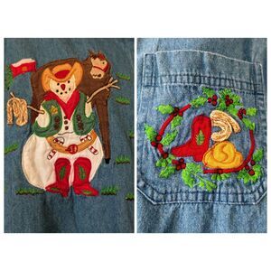 Vtg Bobbie Brooks Christmas Western Embroidered Denim Shirt Sz XL