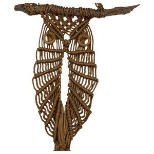 Vtg Boho 70s Handmade Macrame Owl Wall Hanging Jute Driftwood Hippie Rope Art