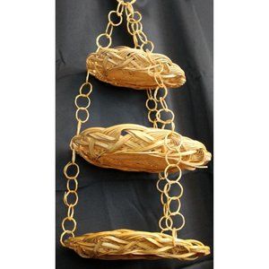 Vtg Boho Tan Beige Woven Bamboo 3 Tiered 19" Hanging Fruit Kitchen Plate Basket