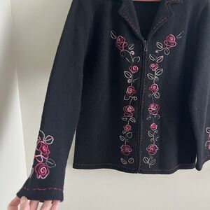 * Vtg Boiled Wool Jacket S Black Floral Embroidered Boxy Cottagecore Artsy Boho