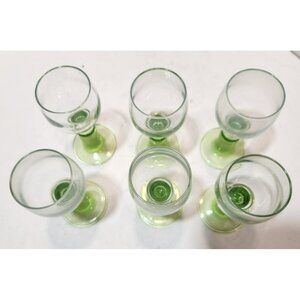 This vintage Bormioli Rocco Italy Limoncino Cordial Green Footed Shot Glasses Set of 6 is a stunning addition to any drinkware collection. Made in Italy in the 1970s, these round cordial glasses feature a clear and green color scheme with a glossy finish. Hand-blown and with a Rococo style, they are perfect for all occasions and add a touch of elegance to any table setting. Hand wash only, these original glasses are a true representation of elegant glass production technique, making them a unique and decorative piece for any enthusiast of vintage glassware. Pre-owned by collector. In good condition with no chips or cracks. Please see pictures for details.