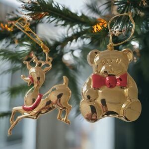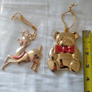 Vtg Brass Ornament Lot of 2 Reindeer Teddy Bear Elk Moose Farmhouse MCM Rustic.