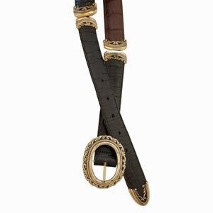 This vintage Brighton women's belt is a must-have for any fashion-forward wardrobe. Crafted from high-quality leather, this belt is reversible, making it a versatile accessory that can be worn with multiple outfits /four options: black, brown, two brown parts an one black or 2 black parts and one brown/. The silver tabs actually swivel and lock to reverse the color to either black or brown. Croc embossed and silver hardware add a touch of metal to the design, giving it an edgy and chic look.