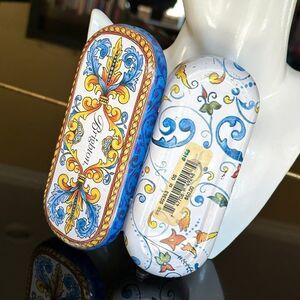 Vintage Brighton white metal/tin glasses case with blue & yellow filigree design. Removable flocked lining inserts for easy cleaning/multipurpose use.