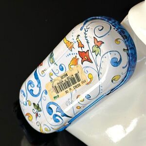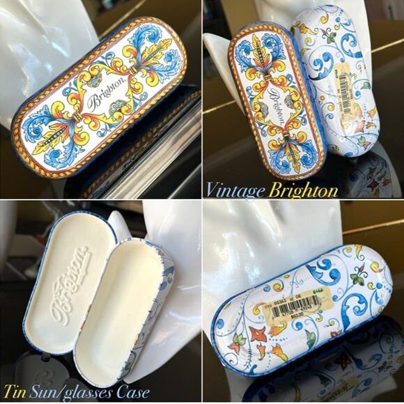 Vintage Brighton white metal/tin glasses case with blue & yellow filigree design. Removable flocked lining inserts for easy cleaning/multipurpose use. This would also make an adorable storage tin for small trinkets--safety pins, buttons, hair ties—you name it! Good vintage condition. Original price sticker still in place. Small dent on back of lid/hinge & some superficial scuffing. Interior has a couple of small (rust?) spots. Please check pics for exact condition prior to purchase! See my listings for all sorts of unique finds & bundle to save BIG on shipping!