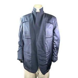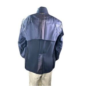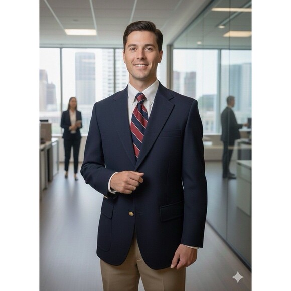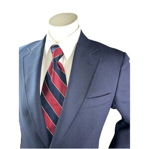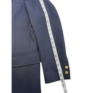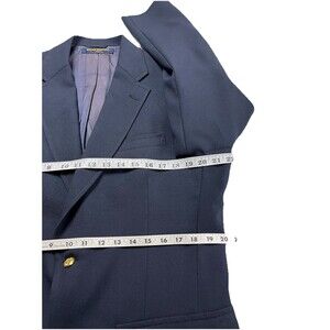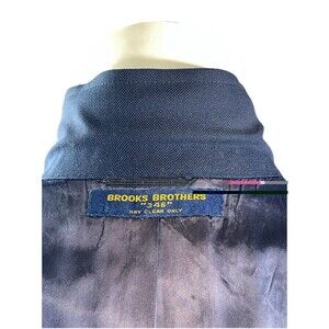 The product is a vintage Brooks Brothers 346 men's blazer jacket in navy blue, made of wool with gold buttons. It features a regular fit, two-button sleeve button style, single-vented jacket vent style, and a single-breasted front button style. The blazer has a solid pattern, notch lapel style, and is perfect for both party/cocktail and business occasions. Made in the United States, this designer piece is suitable for all seasons and is a timeless addition to any man's wardrobe.
