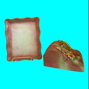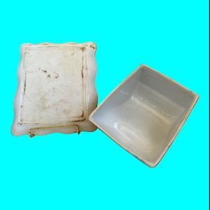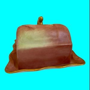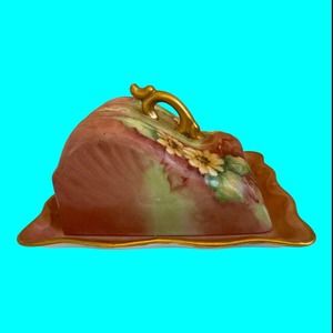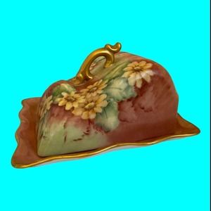 Vintage two piece Butter Dish Or Cheese Dish decorated with Sun Flowers. The handle and edges of the tray are gilded. It has no makers mark. It is in good vintage condition with small imperfections consistent with age and use. The bottom of the tray has a lot of brown marks on it.